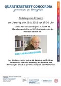 Am 29.11. um 17 Uhr ist es wieder soweit! In den Räumlichkeiten des Quartierstreffs Concordia am Borsigplatz findet ein weiterer spannender Workshop mit dem Zweitzeugen e.V. statt. Janina Fuhr erzählt persönlich und einfühlsam die Überlebensgeschichte des Holocaust-Zeitzeugen Rolf Abrahamsohn.