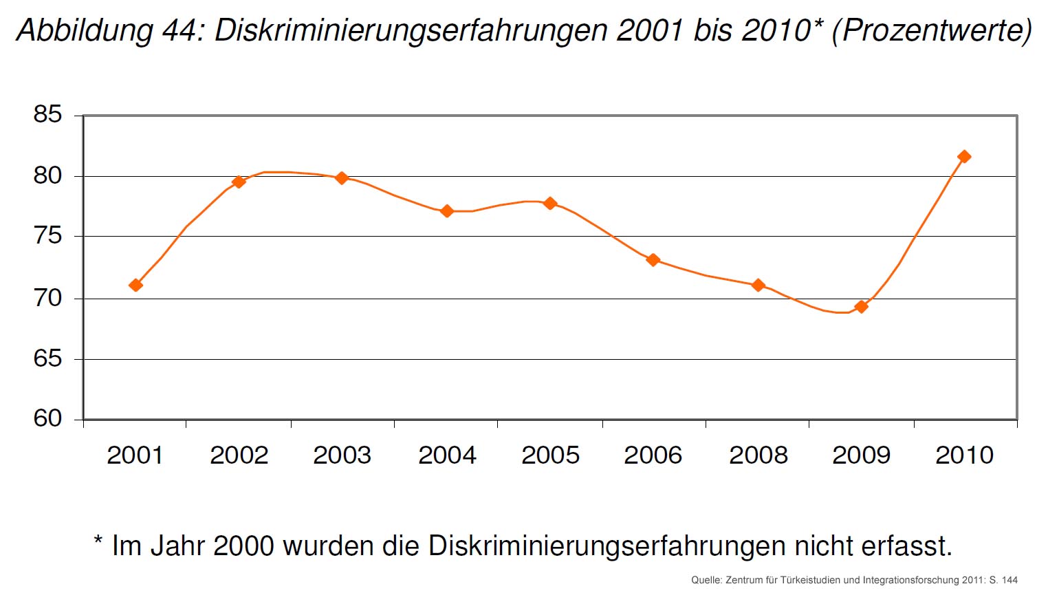 Steht eine geänderte Sensibilisierung oder Empfindlichkeit der Migranten hinter diesen Veränderungen der Diskriminierungswahrnehmung oder hat sich das Maß der tatsächlichen Ungleichbehandlung geändert? Darauf findet die Studie keine Antwort. Die Zeitreihe spiegelt aber deutlich die Schwankungen des allgemeinen Klimas und der politischen und öffentlichen Debatten zum Thema Integration wider. Die durch das von Thilo Sarrazin veröffentlichte Buch ausgelöste Integrationsdebatte hat sicherlich auch zu dem erhöhten Wert der Diskriminierungswahrnehmung 2010 beigetragen