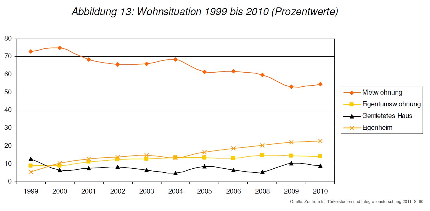 - Wohnsituation: Mietwohnung: 54% (2008: 52%), Miete im EFH: 9% (11%), Eigenheim: 23% (22%), Eigentumswohnung: 14% (15%) – somit verfügen 37% der türkischen Familien über Wohneigentum (D: 52%, Mikrozensus 2006)