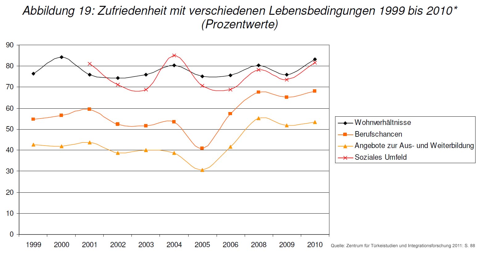 Bei der Betrachtung der parallelgesellschaftlichen Strukturen ergibt der Zeitvergleich zwischen 2001 und 2010 keine eindeutige Tendenz einer Zunahme segregierter türkeistämmiger Migranten, auch wenn der Anteil der Segregierten wieder leicht angestiegen ist (er pendelt zwischen 14% und 19%). Weiterhin hat mehr als die Hälfte der befragten Migranten konkrete Bleibeabsichten (56%). Zwischen den Generationen sind offensichtliche Unterschiede bzgl. der Integration festzustellen: Im Vergleich zur ersten Generation (nur noch rd. 13% der erwachsenen Türkeistämmigen) partizipiert die Nachfolgegeneration (ca. 50%) weitaus besser in allen Bereichen (höhere Schul- und Ausbildungsabschlüsse, bessere Deutschkenntnisse, höhere berufliche Positionen, stärkere Identifikation mit Deutschland, häufigere Kontakte zur Mehrheitsgesellschaft, seltener segregiert).