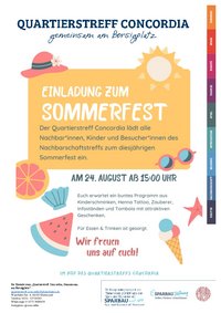 Wir freuen uns darauf, Sie am 24. August 2023 beim Sommerfest des Quartierstreffs Concordia begrüßen zu dürfen. Bringen Sie gerne Ihre Familie, Freunde und Nachbarn mit und verbringen Sie gemeinsam einen unvergesslichen Tag.