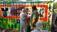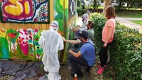 Aus grau mach bunt: KoopLab, INKLUDO PLUS+, Jugendamt und Kindertreff KEZZ gestalten Container auf der Fläche mit Graffiti