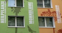 Auf dem Westgiebel sind die lustigsten Blumennamen aufgelistet. Fingerhut und Frauenschuh sind als Teekesselchen bildhaft dargestellt.