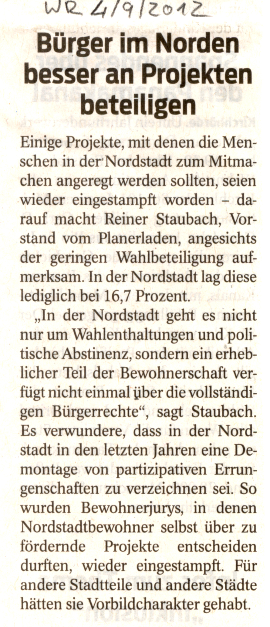 Umso mehr verwundert es, dass in der Nordstadt in den letzten Jahren eine Demontage von partizipativen Errungenschaften festzustellen ist. So wurden die Bewohnerjurys, in denen Nordstadtbewohner selbst über zu fördernde Projekte entscheiden durften, wieder eingestampft, obwohl sie für andere Stadtteile in Dortmund und sogar in anderen Städten Vorbildcharakter haben. Zudem wurde der Konsultationskreis Nordstadt durch deutlich exklusivere Abstimmungsrunden ersetzt. Einziger Lichtblick ist hier noch das von Planerladen und Jugendamt auf den Weg gebrachte Pilotprojekt "Jugendforum", das im Rahmen des Ziel-2-Programms für 3 Jahre gefördert wird. Das aus den Reihen der Bewohnerschaft mit großem Engagement angestoßene Projekt der Umgestaltung und Illuminierung der Unterführung Brinkhoff-/Schützenstraße scheint hingegen nach Mittelkürzungen sang- und klanglos in der Schublade verschwundenen zu sein.