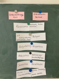 Der Workshop begann mit einer spielerischen Einführung in das Thema Antidiskriminierung, bei der den Schüler*innen die Bedeutung und Wichtigkeit von Gleichbehandlung vermittelt wurde. Es wurden verschiedene Formen von Diskriminierung besprochen, allen voran Rassismus, aber auch Sexismus und Homofeindlichkeit. Nach Erzählungen verschiedenster eigener Diskriminierungserfahrungen bekam die Klasse zielgruppenspezifische Anlaufstellen an die Hand, welche räumlich in unmittelbarer Nähe zur Schule angesiedelt sind und in Diskriminierungsfällen aktiv werden.