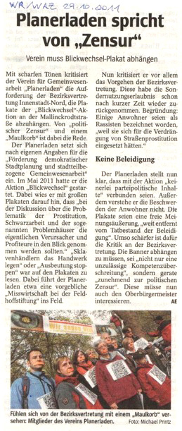 Mit der im Mai 2011 gestarteten Aktion "Blickwechsel" macht der Planerladen e.V. als Servicestelle für Antidiskriminierung darauf aufmerksam, dass bei der Diskussion über die Problematik der Prostitution, der Schwarzarbeit und der sog. Problemhäuser die eigentlichen Verursacher und Profiteure in den Blick genommen werden sollten. Ein Beispiel dafür stellt etwa die Misswirtschaft bei der Feldhoffstiftung als der ehemaligen Eigentümerin einiger dieser Immobilien dar. Seit Beginn der Aktion freut sich der Planerladen e.V. über die vielfältig positive Resonanz seitens verschiedener Institutionen und Personen aus der Nordstadt und darüber hinaus.