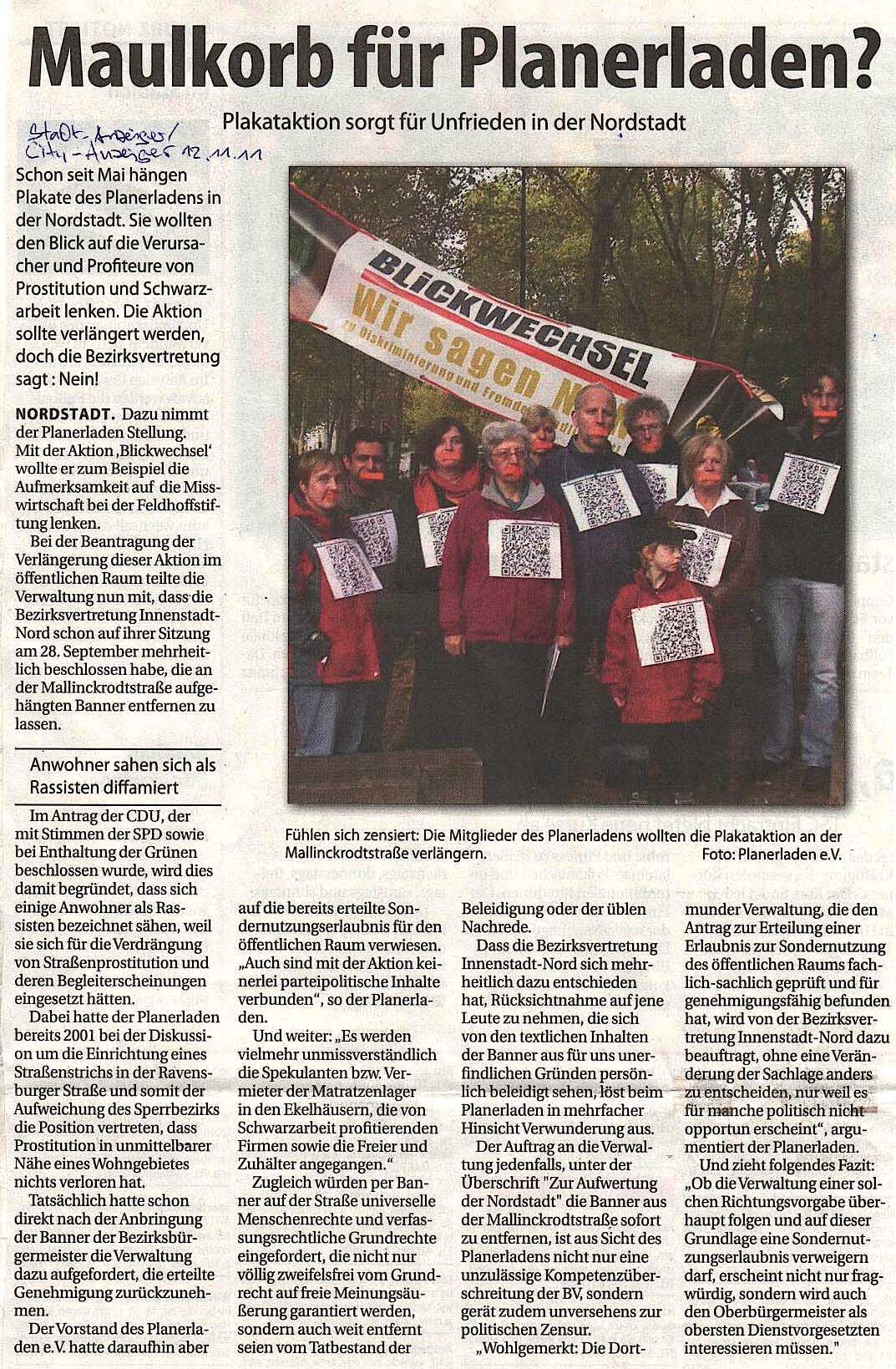 Bei der Beantragung der Verlängerung dieser Aktion im öffentlichen Raum teilte die Verwaltung nun mit, dass die Bezirksvertretung Innenstadt-Nord auf ihrer Sitzung am 28.09.11 mehrheitlich beschlossen habe, die an der Mallinckrodtstraße aufgehängten 7 Banner entfernen zu lassen. Im Antrag der CDU, der mit Stimmen der SPD sowie bei Enthaltung von Bündnis90/DIE GRÜNEN beschlossen wurde, wird dies damit begründet, dass sich einige Anwohner als Rassisten bezeichnet sähen, weil sie sich für die Verdrängung von Straßenprostitution und deren Begleiterscheinungen eingesetzt hätten. Nur zur Klarstellung dieser Absurdität: Der Planerladen e.V. hat bereits 2001 bei der Diskussion um die Einrichtung eines Straßenstrichs in der Ravensburger Straße und somit der Aufweichung des Sperrbezirks die Position vertreten, dass Prostitution in unmittelbarer Nähe eines Wohngebietes nichts verloren hat.