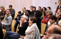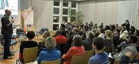 Das Publikum ergänzte an vielen Stellen die Podiumsbeiträge. Teilweise bestehen noch Schwierigkeiten bei der Koordination beim Einsatz Freiwilligen Angebot und Nachfrage zusammen zu bringen. Hinweise zu Webseiten wurden ausgetauscht, wo man sich diesbezüglich anmelden kann. Auch besteht weiterhin Wohnungsmangel für Flüchtlinge. Auch wenn einiges noch als optimierungsbedürftig gesehen wird, so aber bewegt sich insgesamt doch schon sehr viel nach vorne.
