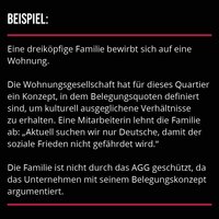 Ein Schlupfloch im Allgemeinen Gleichbehandlungsgesetz (AGG) ermöglicht Vermietenden aber genau diese Argumentation: Eine Häufung von bestimmten kulturellen oder sozialen Merkmalen wird mit Instabilität für den Wohnungsbestand verknüpft. Das ist unseriös, wissenschaftlich nicht belegbar und vor allem diskriminierend!