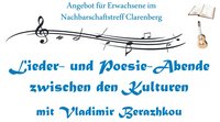 Auf Einladung des Initiators der Reihe Yuriy Punkin wird der russische Poet, Komponist und Sänger Vladimir Berazhkou aus seinem Repertoire vortragen. Er begleitet sich dabei selbst auf der Gitarre. Herr Punkin wird für die nicht russisch sprechenden Gäste die Inhalte der Werke ins Deutsche übersetzen.