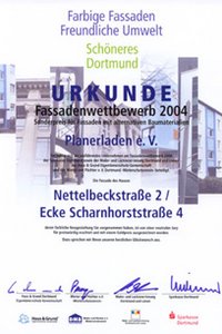 Die im URBAN II-Projekt BILDERFLUT an der Nettelbeckstraße in der Dortmunder Nordstadt entstandene künstlerische Fassadengestaltung erhielt den "Sonderpreis für Fassaden mit alternativen Baumaterialien", im Fassadenwettbewerb 2004, der nun - Ende 2005 - verliehen wurde.