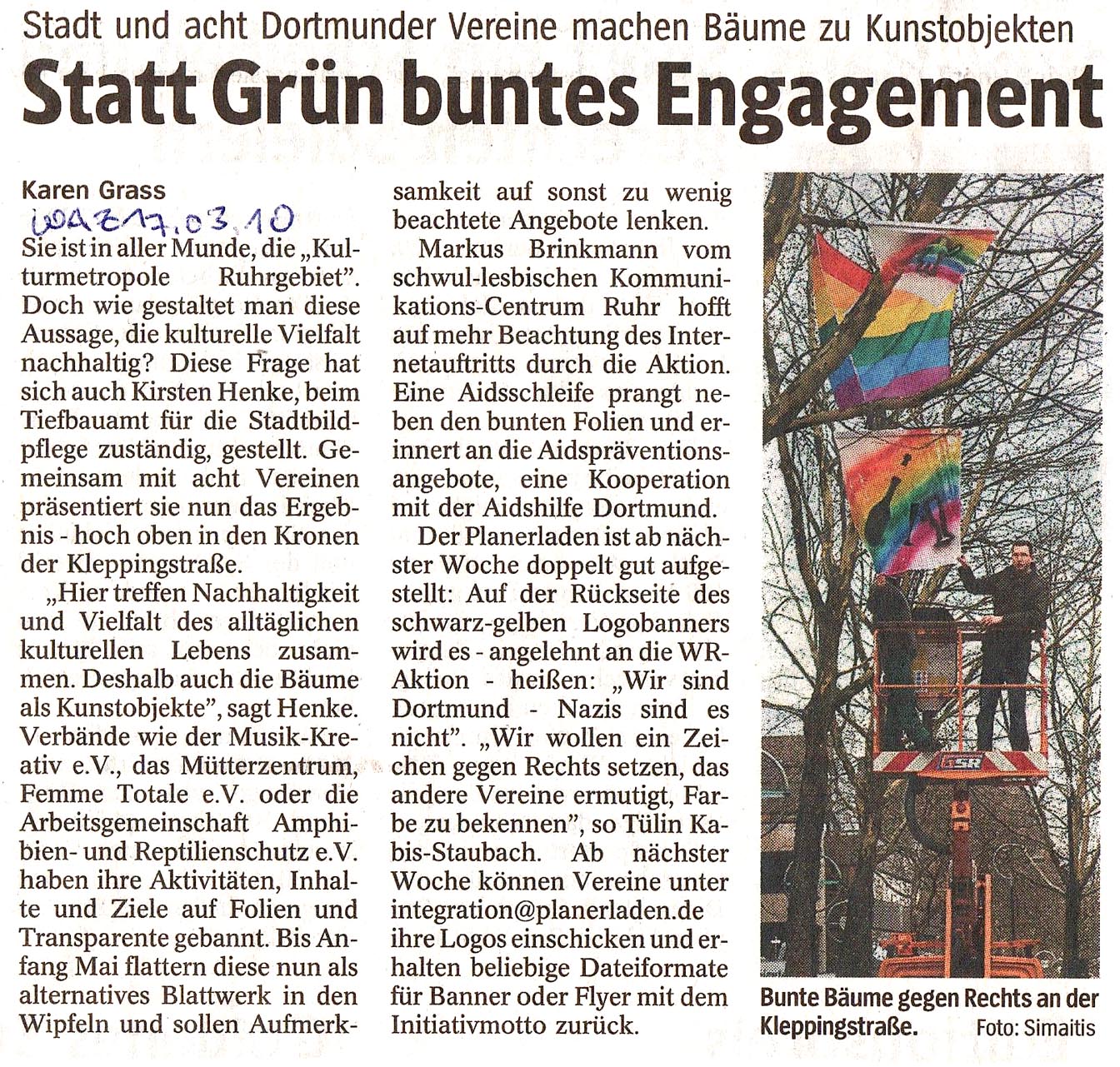Der Planerladen hat in diesem Zusammenhang mit großer Freude die stadtweite Plakat-Aktion „Wir sind Dortmund“ der Westfälischen Rundschau zur Kenntnis genommen und begrüßt den Aufruf der WR, der in Kooperation mit der Deutschen Post realisiert wird. Der Planerladen schätzt und unterstützt die Aktion voll, da dadurch in großer Bandbreite und Reichweite in Dortmund ein kraftvolles Zeichen gegen Rechtsextremismus und Fremdenfeindlichkeit gesetzt wird. Zufälligerweise sind die Planungen der beiden Projekte in den selben Zeitraum gefallen. Der Planerladen sieht seinen Beitrag zu dem bereits seit Januar in Umsetzung befindlichen Kulturhauptstadt-Projekt „Vereinsbäume“ als Auftakt zu einer größeren Aktion, die im Rahmen der Internationalen Wochen gegen Rassismus (15.3. bis 28.3.2010) starten wird.