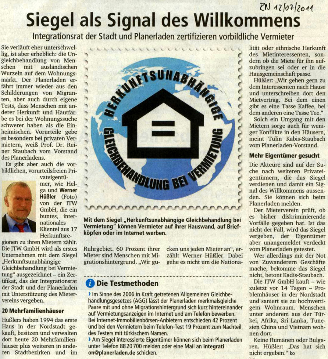 Die ITW GmbH ist der erste vom Integrationsrat der Stadt Dortmund und dem Planerladen e.V. – unterstützt durch den Mieterverein Dortmund – mit dem Siegel „Herkunftsunabhängige Gleichbehandlung bei Vermietung“ ausgezeichnete Vermieter.