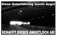 Für zwei Stunden gestalteten Bewohner aus dem Nachbarschaftsforum am Freitag, den 28.11.03, Teile der Bahnunterführung zur Schützenstraße/Brinkhoffstraße mit Licht und farbigen Motiven. Auf einem kleinen Teilstück des Fußgängerweges unter der Bahnunterführung versammelten sich die Bewohner mit Informationswänden und Handzetteln: "Diese Unterführung macht Angst", "Sie ist dunkel, dreckig und laut", "Schafft dieses Angstloch ab!", "Es geht auch anders!" waren einige ihrer Forderungen.