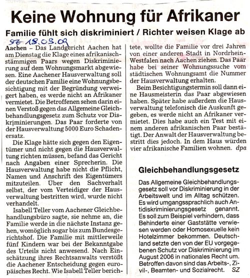 Das Aachener Landgericht hat gestern die von der Stiftung "Leben ohne Rassismus" unterstützte Klage einer dunkelhäutigen Familie, die bei der Wohnungssuche benachteiligt wurde, abgewiesen.
