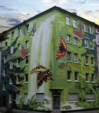 Die unterschiedlichen Schmetterlinge und die Wasserfalllandschaft stehen symbolisch für die kulturelle Vielfalt und die zahlreichen grünen Oasen der Nordstadt. Der Eigentümerin war es ein Anliegen, diese paradiesischen Zustände, die man in der Nordstadt finden kann, im Wandbild zu thematisieren. Als Textelemente finden sich in der Fassadengrafik einige Antworten aus dem Beteiligungsverfahren mit Jugendlichen der St. Gertrudis-Gemeinde wieder. Das Wandbild wurde von Herrn Uwe Rothe entworfen und vom Team Bilderflut künstlerisch umgesetzt.
