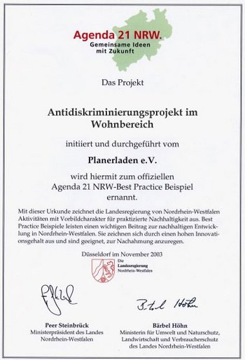 Das Antidiskriminierungsprojekt des Planerladen e.V. wurde als ausgewähltes Best Practice Beispiel von der Nordrhein-Westfälischen Landesregierung im Rahmen der Agenda 21 NRW wegen seines innovativen und vorbildhaften Charakters gewürdigt.